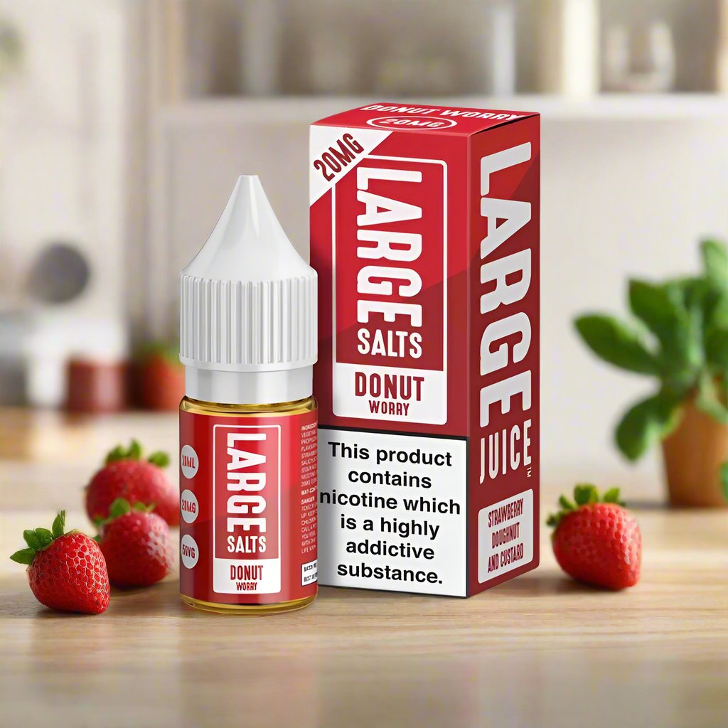Donut Worry salt nicotine e-liquid by Large Salts is a sweet and fruity dessert blend. The rich donut flavour acts as a base, combined with strawberry jam and a creamy vanilla bean custard.
